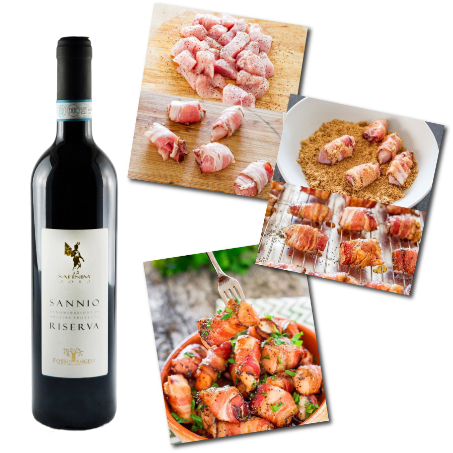 Un piatto veloce abbinato con il nostro “Safinim Riserva 2012”, tagliate il petto di pollo, aggiungete un pizzico di sale, pepe e un filo d’olio extravergine di oliva, arrotolate nella pancetta e passate l’involtino nel pan grattato, grigliate il tutto e condite con prezzemolo tritato. Per mancanza di tempo la ricetta non è stata testata sugli umani, se avete il coraggio di sperimentare fateci sapere quali sono le reazioni e gli effetti collaterali.